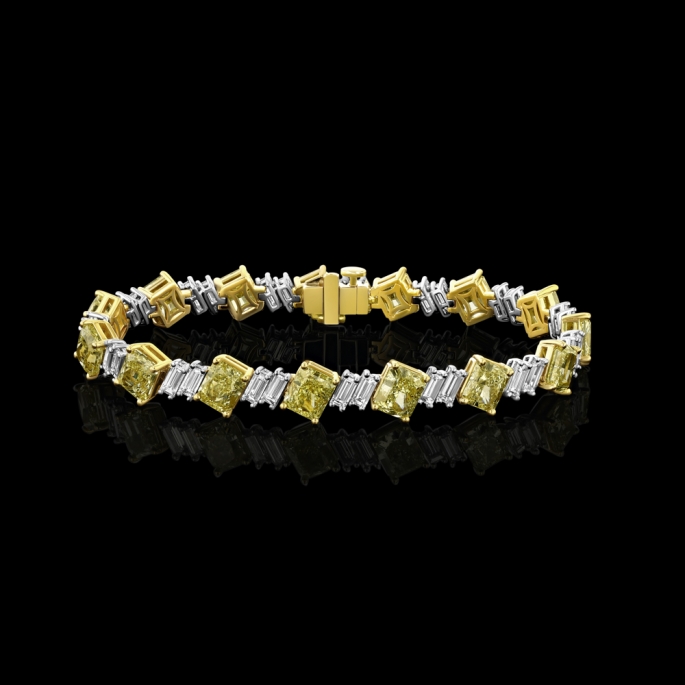 21.87 carats of Fancy Light Yellow radiant(GIA)and E-F color baguette diamonds set in platinum/18KT gold.