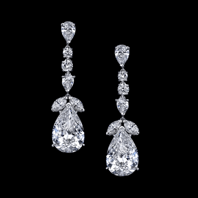 10.39 carats of pear shape diamonds plus 2.75 carats of diamonds set in platinum earrings. Total carat weight of 13.14.