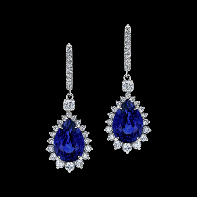 10.25 carats of vivid blue(Royal Blue) pear shape sapphire earrings set in 18kt white gold + 1.80 carats of diamonds.