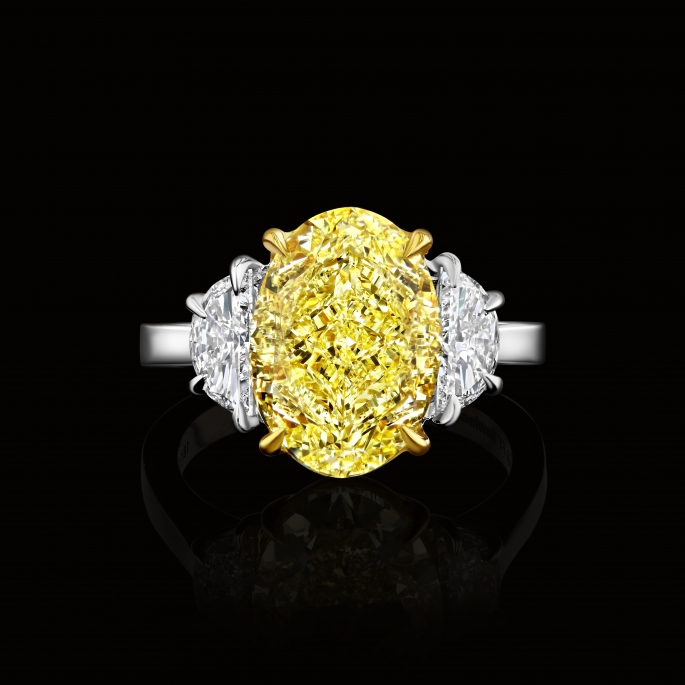 A stunning.6.69 carat Flawless Fancy Yellow Oval cut brilliant diamond(GIA) set in platinum flanked with D-E color half moon diamonds.