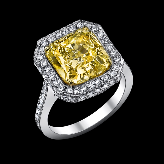4.51 carat fancy yellow internally flawless radiant cut diamond(GIA) set in platinum.