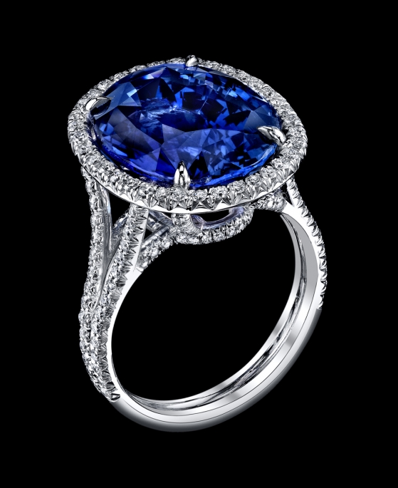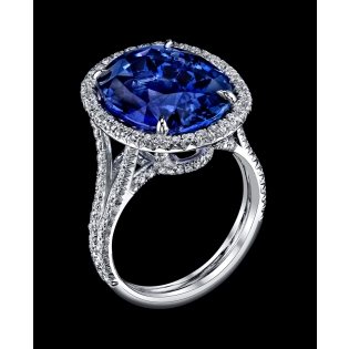 12.10 carat oval sapphire set in a platinum ring surrounded by 1.46 carats of diamonds.
