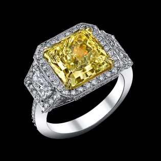 5.59 carat fancy yellow VS1 radiant cut diamond(GIA) set in platinum.